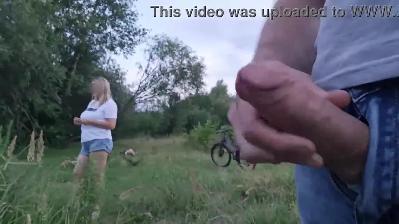 A young man with a massive, uncut cock stands in public, teasing a beautiful blonde girl with his solo masturbation. She can't resist watching as he cums all over his hand, her eyes glued to his fat dick. The student then proceeds to flash his creampied hand near her, much to her delight.